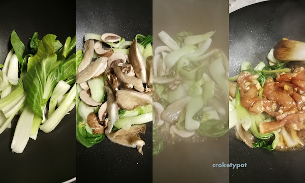 En el wok (o sartén grande) ponemos aceite de sésamo o en su defecto aceite de oliva AOVE, cuando el aceite esta caliente ponemos el pak choi, se rehoga un par de minutos, entonces añadimos las setas y seguimos rehogando otro par de minutos sin dejar de mover.
