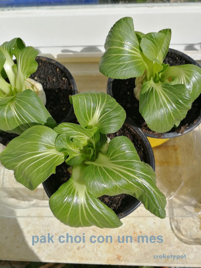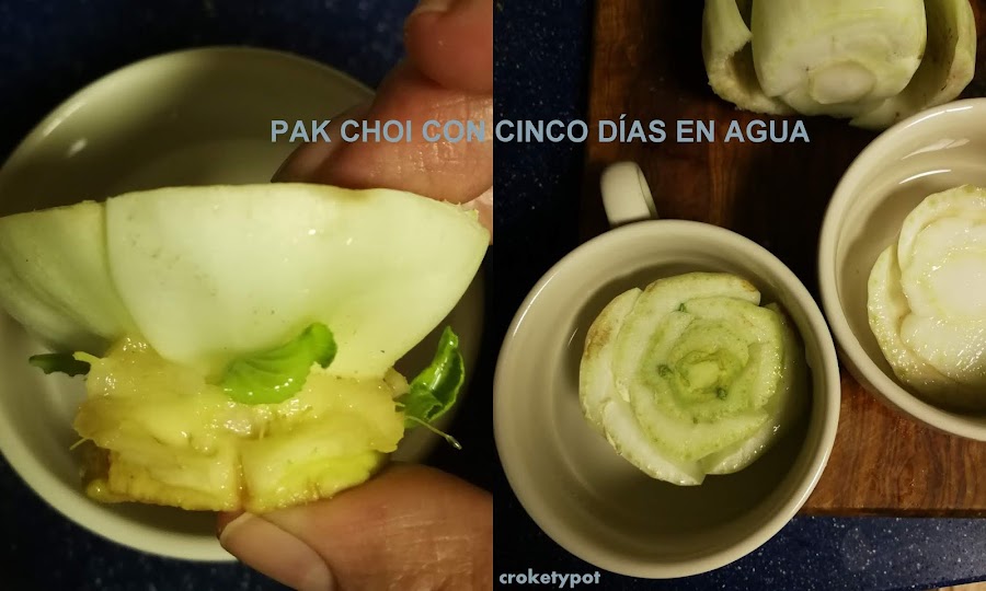 Cuando arreglo el pad choi, al cortar la parte de abajo, no lo tiro, lo pongo en una taza con un poco de agua y no he visto cosa igual, empieza a crecer con una velocidad, que a los diez días ya comienzan a salir raices y se puede sembrar en la tierra. En cuestión de un par de meses tenemos otro pad choi y así sucesivamente, mirad las fotos.