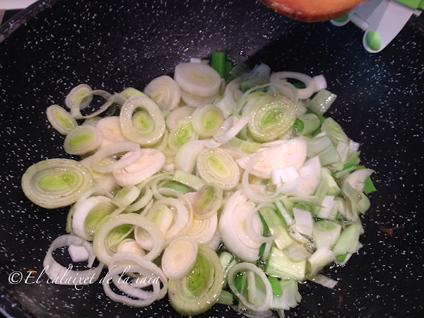 El el aceite de haber sellado el pollo pondremos a ppochar primero la cebolleta y el puerro