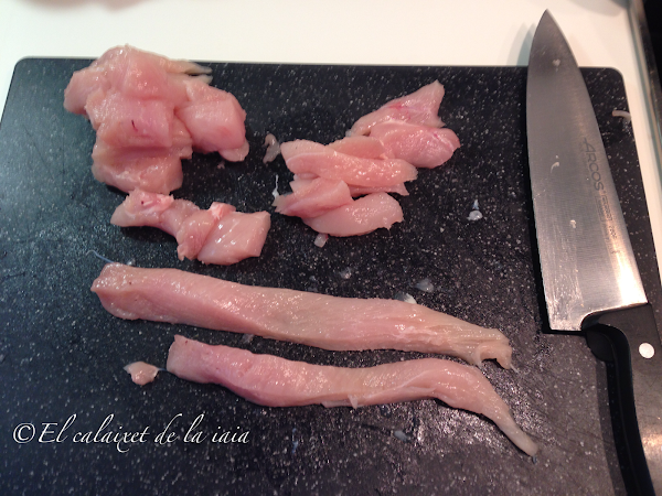 limpiamos los resto de grasa de la pechuga y troceamos