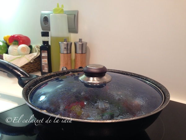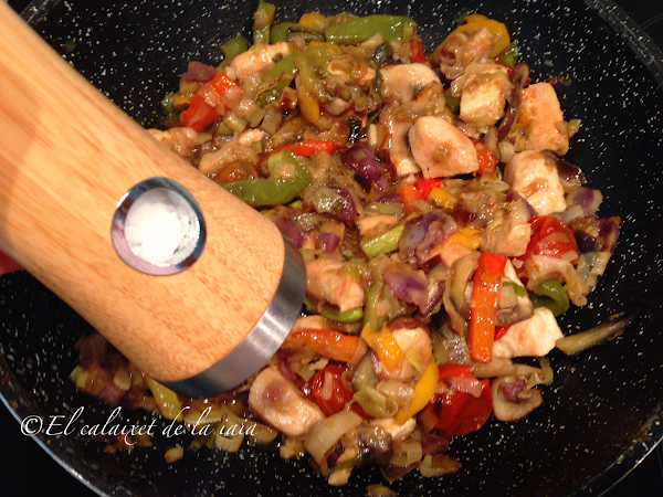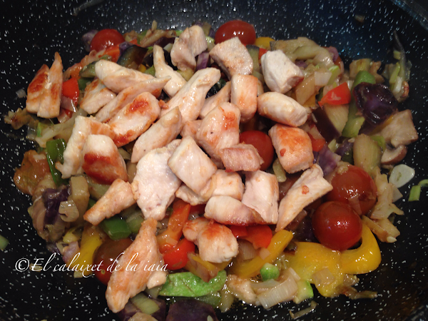 tapamos y dejamos unos minutos al fuego medio para que el pollo acabe de hacerse junto a las verduras y quede jugoso