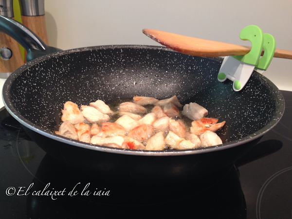 en un wok o sartén de tipo wok ponemos a calentar un poco de aceite de oliva, sellamos la pechuga y reservamos