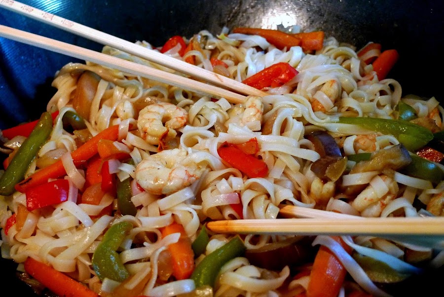 Calentamos un poco de aceite en el wok y vamos incorporando las verduras en tandas. Primero la cebolla, luego los pimientos, zanahoria, calabacín y berenjena. Los vamos rehogando. Salpimentamos ligeramente y añadimos la guindilla en cantidad proporcional a nuestro gusto por el picante