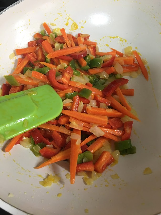sésamo negro o normalSe pone en el wok el aceite a calentar. Se añade la cebolla muy picada y se rehoga 2 minutos. A continuación se añaden los pimientos lavados y picados y la zahahoria, pelada y cortada en tiras finas o juliana: