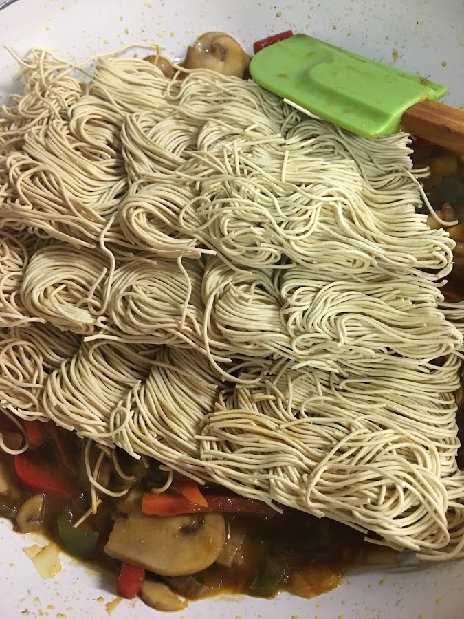 Si se utilizan tallarines, se hierven de la forma habitual en agua, se escurren y se añaden a las verduras.