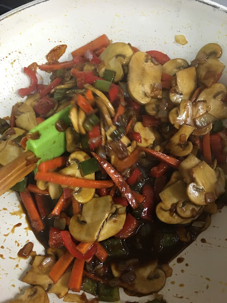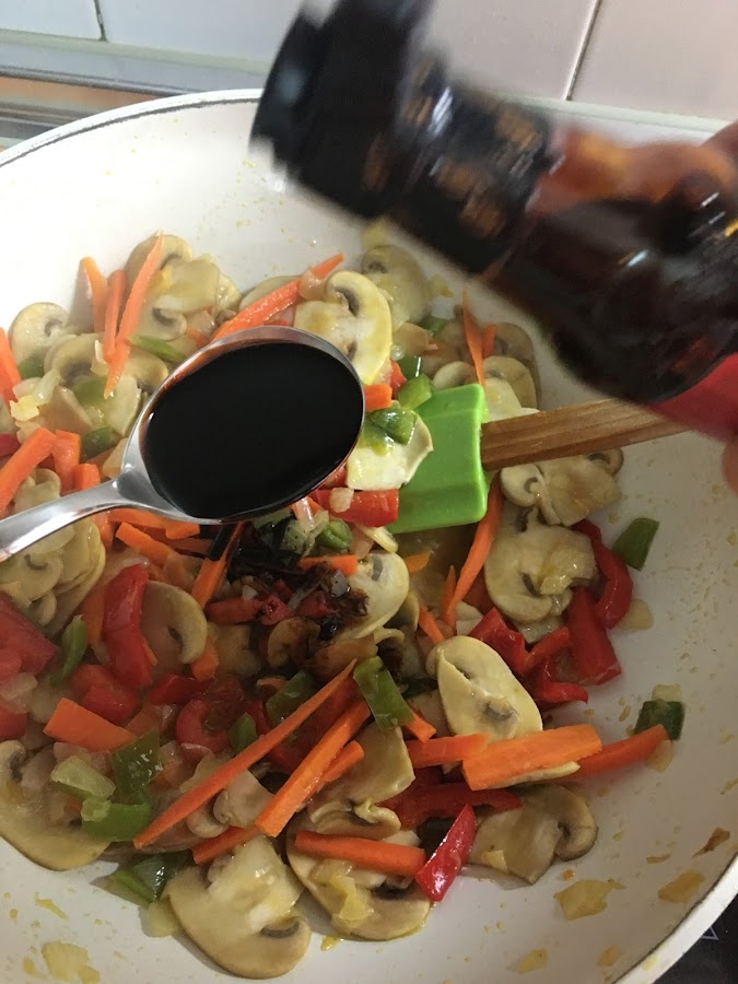 Se incorporan las dos cucharadas de salsa de soja y se remueve: