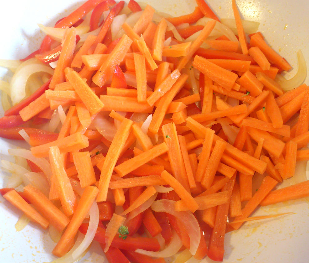 5. Sin esperar tampoco mucho incorporamos la zanahoria. Se rehoga otro poco. Si ves que la verdura se está resecando puedes echar pequeños chorritos de agua para hidratarla.