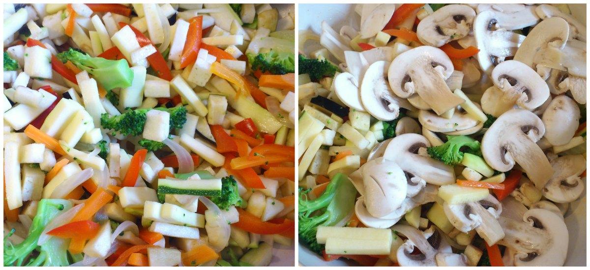 7. Después el calabacín, la berenjena y los champiñones. Con cuidado se mezcla todo bien.
