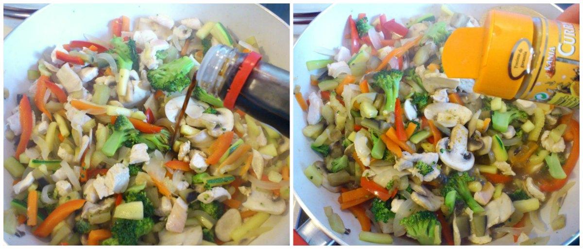 9. Cuando el pollo empiece a blanquear, añadimos un buen chorro de salsa de soja y se remueve. Después se le echa unos polvitos de Curry. Según se vaya cocinando se prueba y se rectifica de sal. También puedes echarle más Curry o Salsa de Soja si lo ves necesario según tu gusto.