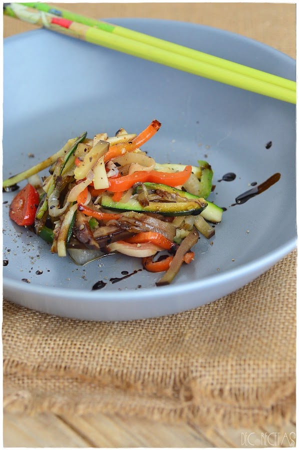 En un wok con una gota de aceite bien caliente, añadí las verduras con media cebolla picada en juliana y calabacín añadiendo 30ml de salsa de soja sin dejar de remover a fuego algo durante 2 minutos.