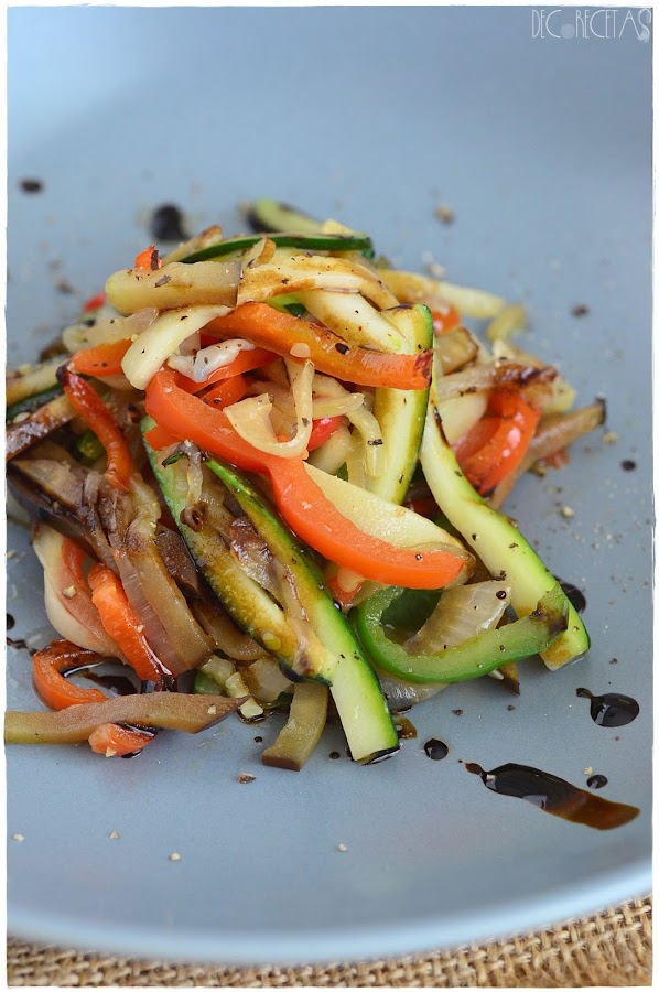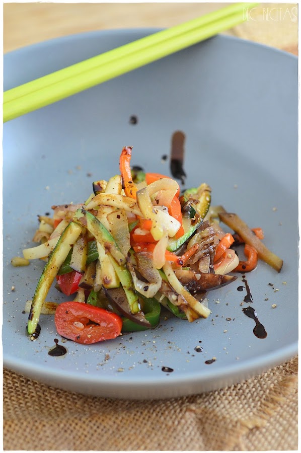 En esta ocasión, añadí pimiento rojo y verde, calabacín,berenjena, cebolla y unas vainas de soja que encontré como novedad en mi supermercado. Para comprobar el tiempo que cada verdura debía estar al vapor, simplemente fui pinchando con un tenedor y cuando la notaba algo tierna, la sacaba e introducía otra