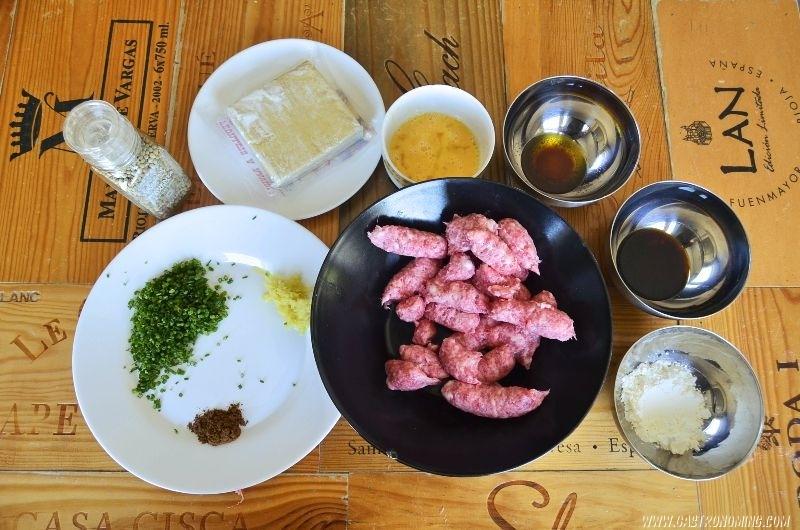 1. Destripamos las salchichas quedándonos solo con la carne picada interior.2. En un bol grande mezclamos la carne picada, salsa de soja, aceite de sésamo, pimienta blanca, cebollino picado, 5 especias chinas, el jengibre rallado y la Maizena, mezclamos bien, tapamos y guardamos en frío al menos 2 horas.