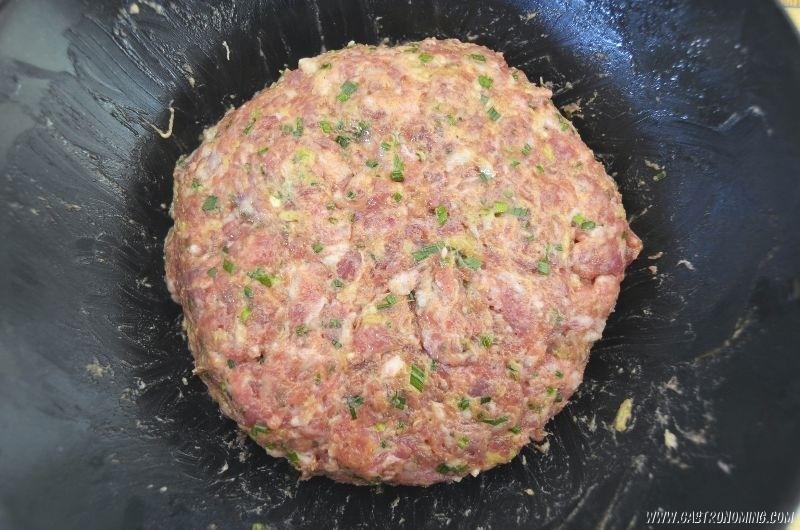 En un bol grande mezclamos la carne picada, salsa de soja, aceite de sésamo, pimienta blanca, cebollino picado, 5 especias chinas, el jengibre rallado y la Maizena, mezclamos bien, tapamos y guardamos en frío al menos 2 horas.