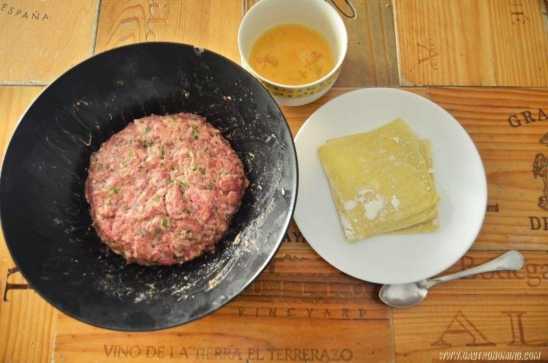 Colocamos un pellizco de de la mezcla de carne un poco justo por debajo a la derecha del centro, justo del lado que hemos untado el huevo.