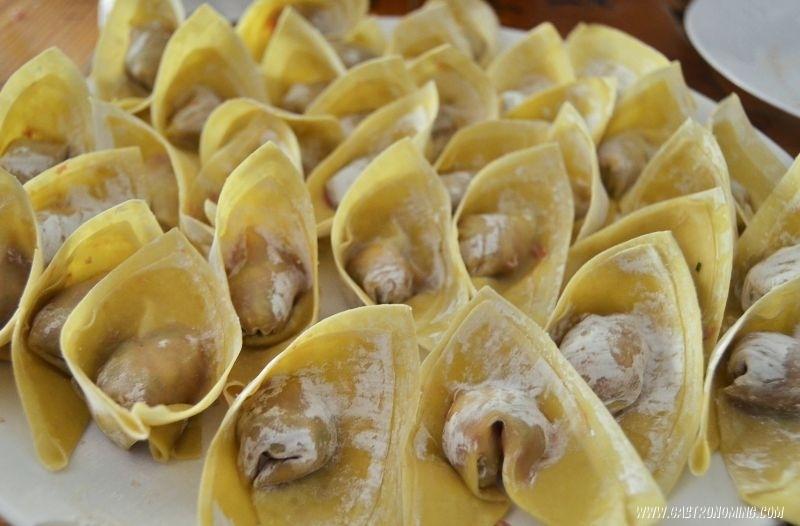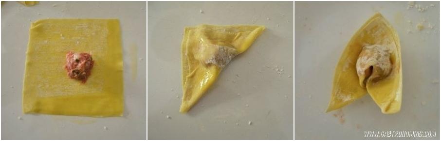 7. Untamos un poco más de huevo batido al lado izquierdo de donde está la carne y por debajo, justo al lado contrario del lado derecho, que son los puntos que vamos a unir y así damos forma a nuestros wontones antes de freír, casi como una “barquitas”, Reservamos.