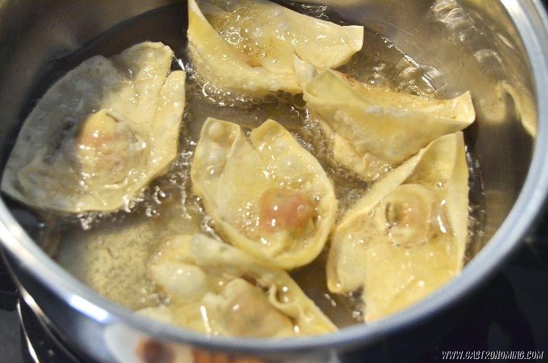 8. Ponemos en una sartén o cazuela al menos 2 dedos de aceite y calentamos a fuego medio y solo cuando es´te caliente vamos a ir friendo los wontones por tandas. Vamos reservando sobre papel absorbente para quitar el exceso de aceite.