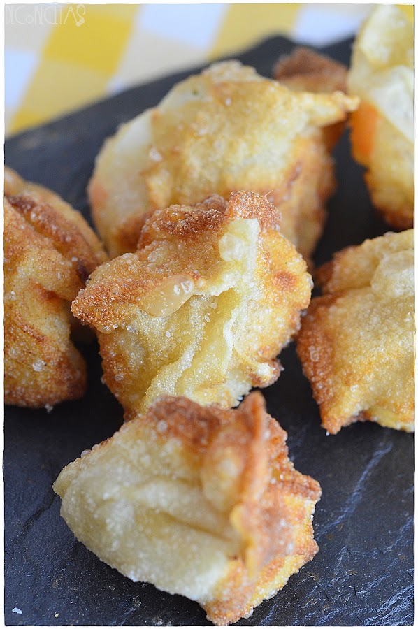 Tenía la masa wonton en la nevera y al estar abierto el paquete, tiende a endurecerse, así que para aprovecharla, más wontons que siempre son un aperitivo estupendo