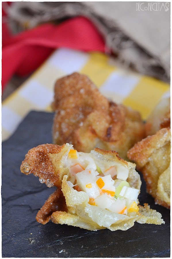 Esta vez con lo que tenía por la nevera: Palitos de cangrejo o surimi y queso batido 0%. Mezclé y añadí cebollino picado, y relleno listo para introducir el las porciones de masa wonton. Esta vez, decidí freírlas ya que me encanta la textura de la masa así :)