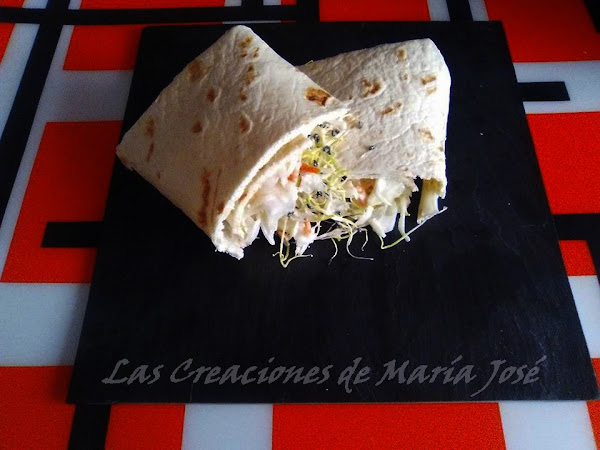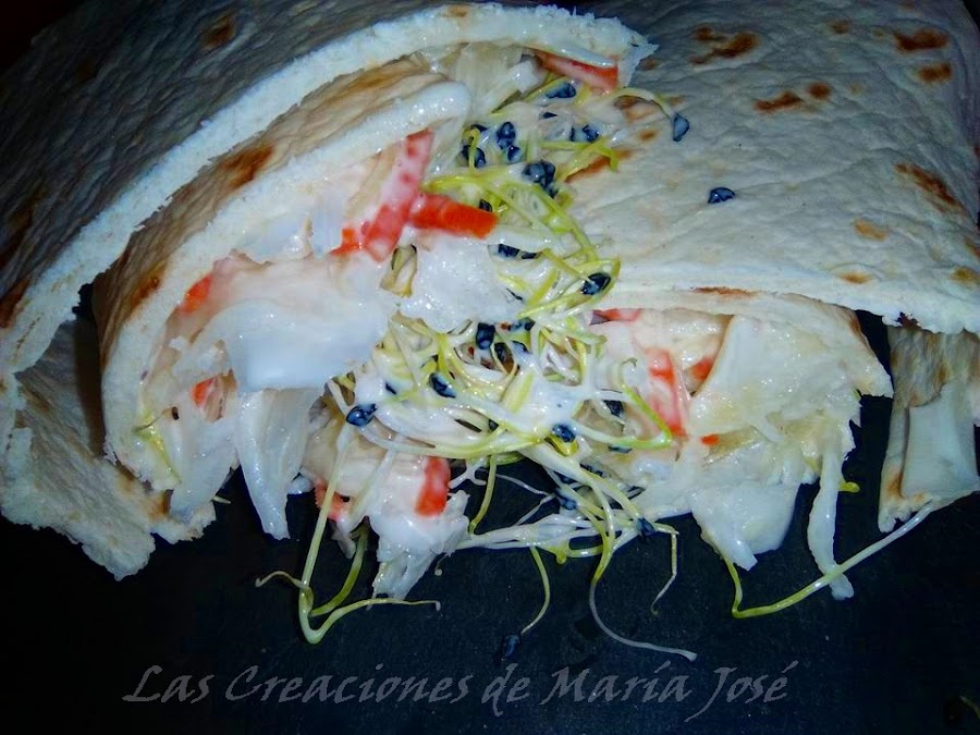 Pelamos las zanahorias y las cortamos en tiras pequeñas. Limpiamos el repollo y lo cortamos también en tiras pequeñas. Echamos una cucharadita de mostaza y mayonesa según la cantidad que hayáis hecho. Ponemos en el wrap un puñado de germinado de cebolla y encima la ensalada, enrollamos.