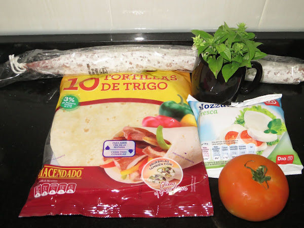 Partimos en trozos la bola de mozzarella, el tomate, les echamos sal y añadimos con sal. Mientras tanto calentamos las tortillas de trigo en el horno o en una sartén. Ahora partimos en rodajas el fuet y lo añadimos a la anterior ensalada.