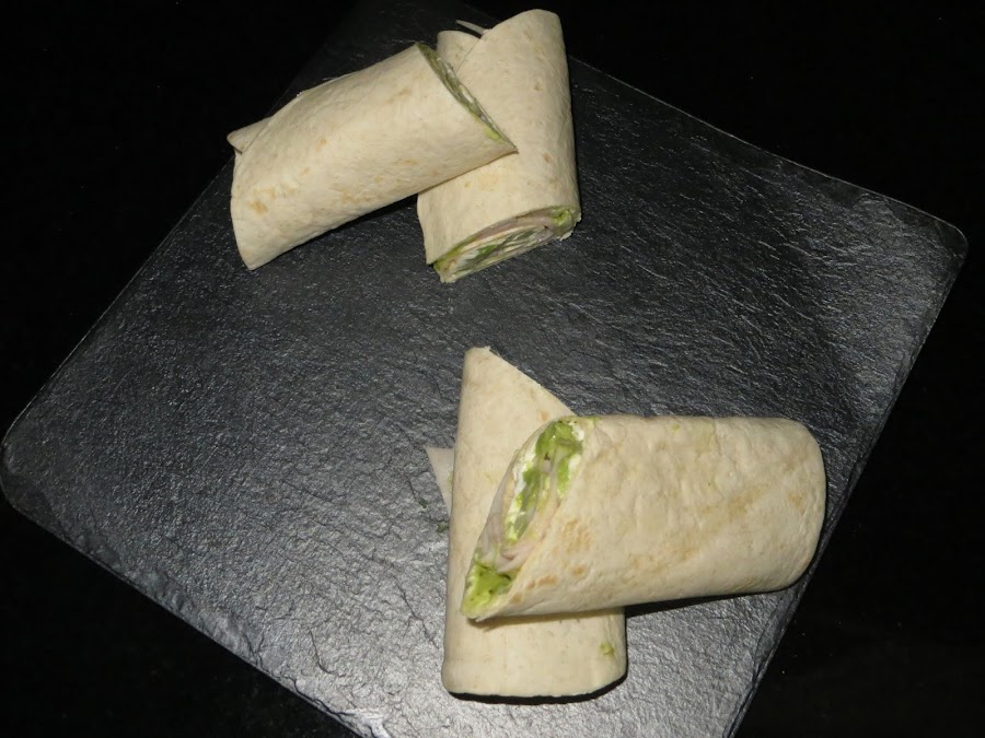Cogemos la tortilla de trigo y le untamos una capa generosa de queso crema, también puede ser mayonesa, ponemos encima el fiambre de pavo y el aguacate en lonchas. Con un tenedor aplastamos un poco el aguacate para que luego sea más fácil de enrollar. Si queremos darle un toque picante añadimos un jalapeño en trocitos.