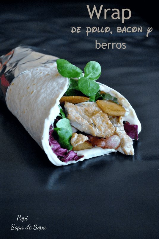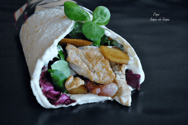 Calentar las tortillas en una sartén vuelta y vuelta, untarlas con la salsa preparada, colocar encima los berros, la achicoria, manzana, pollo, bacon y las nueces. Enrollar y servir.