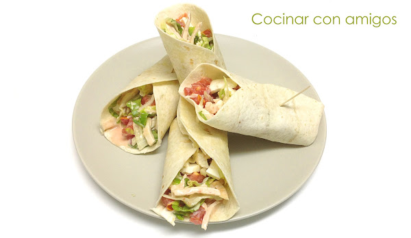 Según Wikipedia un wrap es una variante del taco que incluye rellenos de sándwich envueltos en una tortilla u otro pan plano blando, aunque a mi este wrap de pollo me recuerda más a una ensalada hecha rollito :)