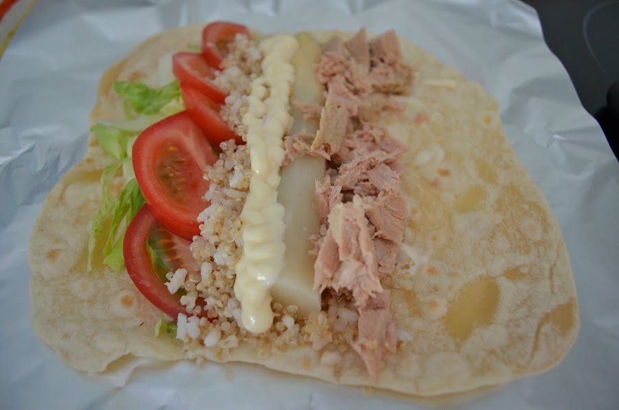 Cortar la lechuga en juliana. El tomate en rodajas finas. Desmenuzar el atún y cocer la quinoa (antes de cocer lavarla bien) durante 18 minutos en abundante agua con sal, refrescarlo y dejar escurrir bien antes de poner en el wrap.
