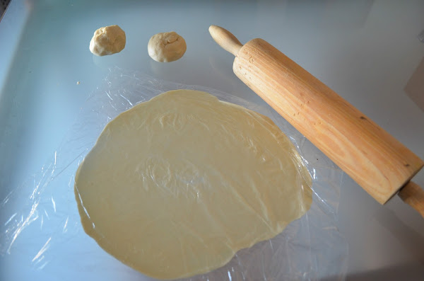 Poner un trozo de papel film en la mesa una bola y cubrir con otro trozo de papel film. Aplastar con las manos o con una cazuela, lo que quieras. Acabar de estirar con el rodillo, yo la deje muy fina.
