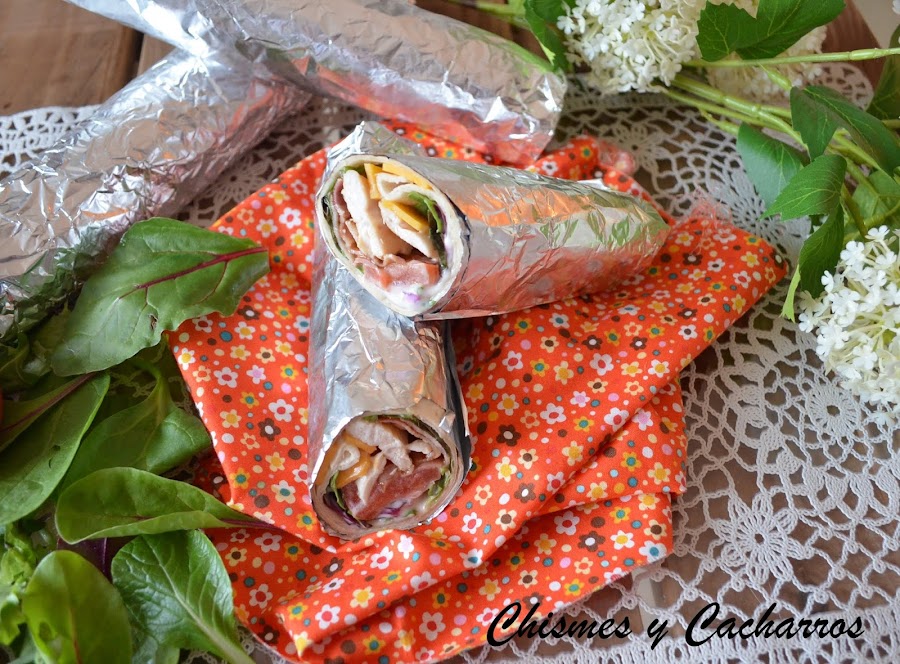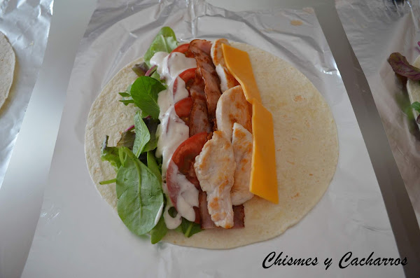 Poner un trozo de papel de aluminio de bajo de la tortilla como en la foto. Poner los ingredientes y con la ayuda del papel de aluminio enrollar el wrap de izq a drch, cerrar bien los extremos y guardar en el frigorífico 1 o 2 horas. Sacar y cortar por la mitad y disfrutar.