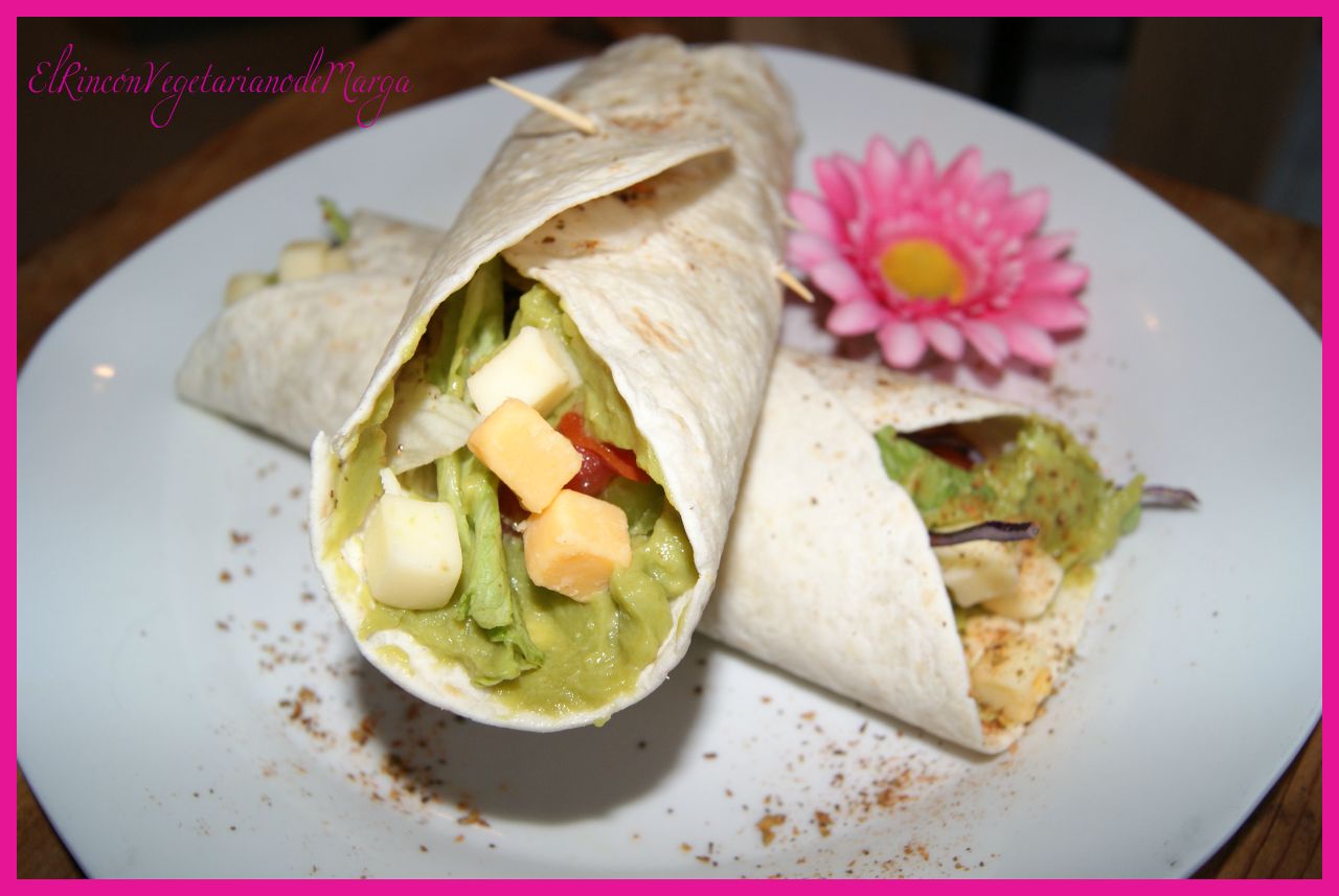 Muy fácil. En una sarten sin aceite calentamos la tortilla de maíz, por ambas caras. Cuando esté caliente la sacamos y la untamos con el guacamole, le ponemos por encima la ensalada, el tomate y los taquitos de queso. Lo cerramos haciendo forma de rulo y a comer!
