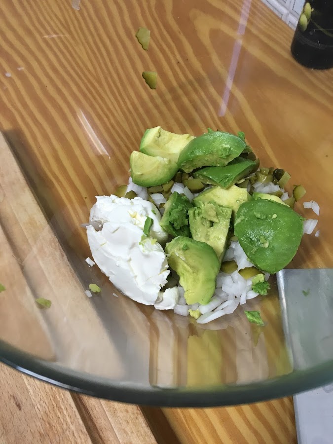 Seguidamente pelamos y troceamos los aguates y también los llevamos al bol. Seguidamente le añadieremos las dos cucharadas de queso cremoso (tipo Philadelphia) y el lomo de salmón ahumado troceado en dados pequeños.