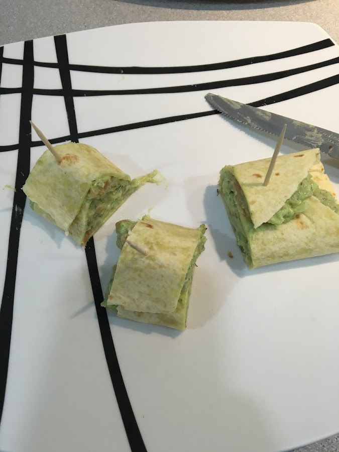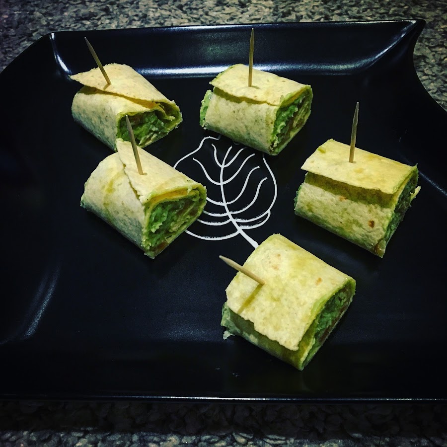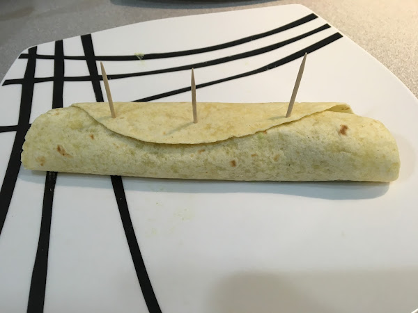 Ahora deberemos coger las tortitas calientes y de una en una los rellenamos, las enrollamos, las aseguramos con palillos y cortamos la tortita en trozos. Podemos descartar las puntas de la tortita que no habrán quedado rellenas.