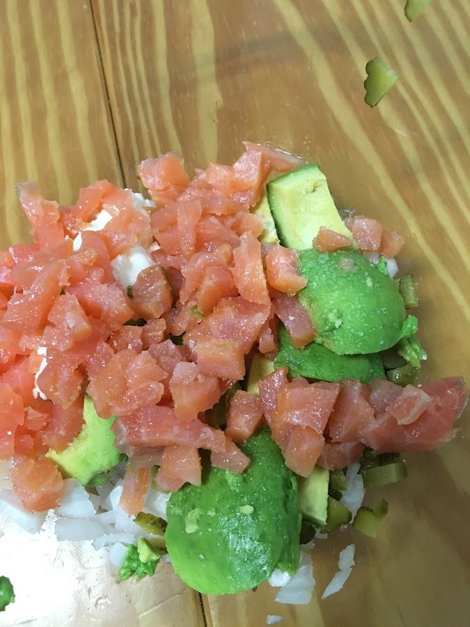 Seguidamente pelamos y troceamos los aguates y también los llevamos al bol. Seguidamente le añadieremos las dos cucharadas de queso cremoso (tipo Philadelphia) y el lomo de salmón ahumado troceado en dados pequeños.