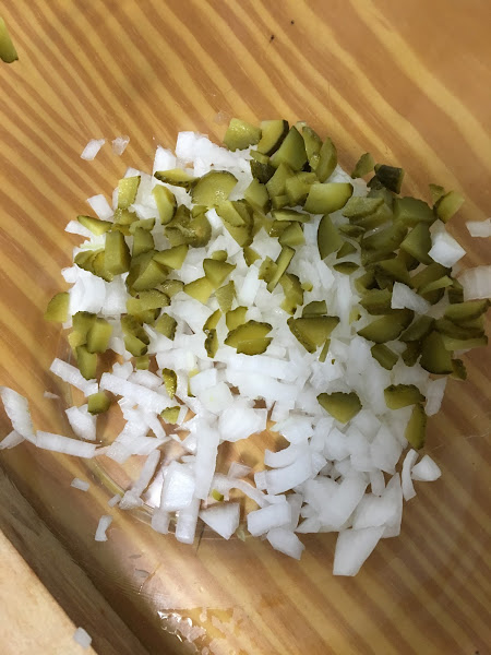 Cortamos la cebolla muy finita y la introducimos en un bol. Cortamos también en trozos pequeños los pepinillos y los añadimos a la cebolla.