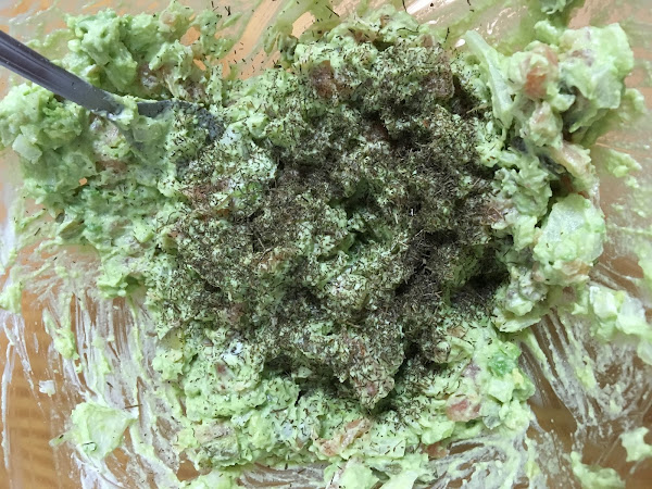 Una vez lo tenemos todo amasado, añadimos la cucharada de eneldo seco y lo acabamos de mezclar y amasar con la ayuda del mismo tenedor.