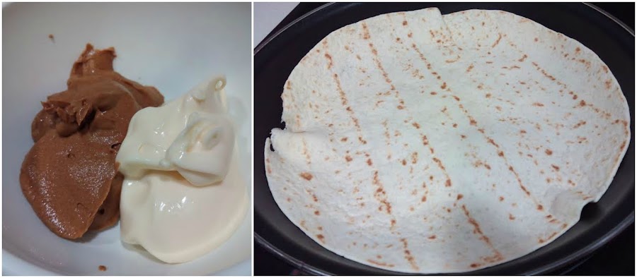 En un bol mezclamos 3 cucharaditas de mostaza con 3 de mayonesa. Por otra parte calentamos las tortillas en una sartén.