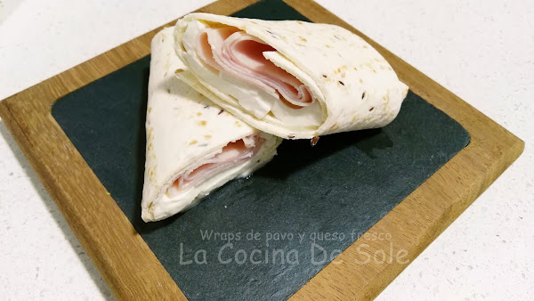 Sobre el wraps, colocamos lonchas de queso fresco y fiambre de pavo a lo largo, no en el centro, sino al principio de la torta, dejando a los lados un dedo y medio mas o menos para luego poder cerrar los lados hacia a dentro.