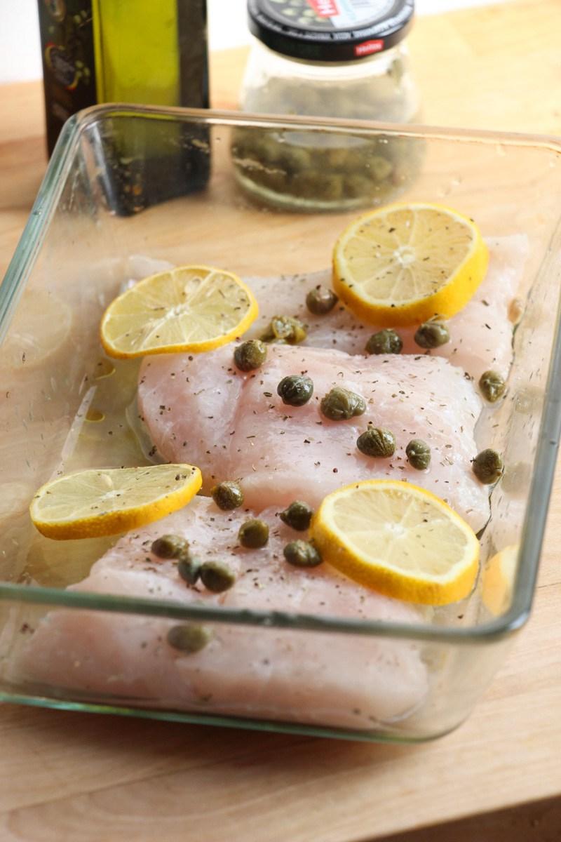 En un recipiente grande apto para el horno rociar un chorrito de aceite de oliva y colocar los filetes de pescado con la piel mirando hacia abajo (si tienen). Por encima agregar unas rodajas de limón, el jugo de 1/2 limón, una cucharada de alcaparras, una pizca de pimienta y una pizca de sal. Opcionalmente se le puede agregar 1 chorrito de vino blanco por encima.Cocinar el pescado al horno durante aprox 15 minutos a 180°C