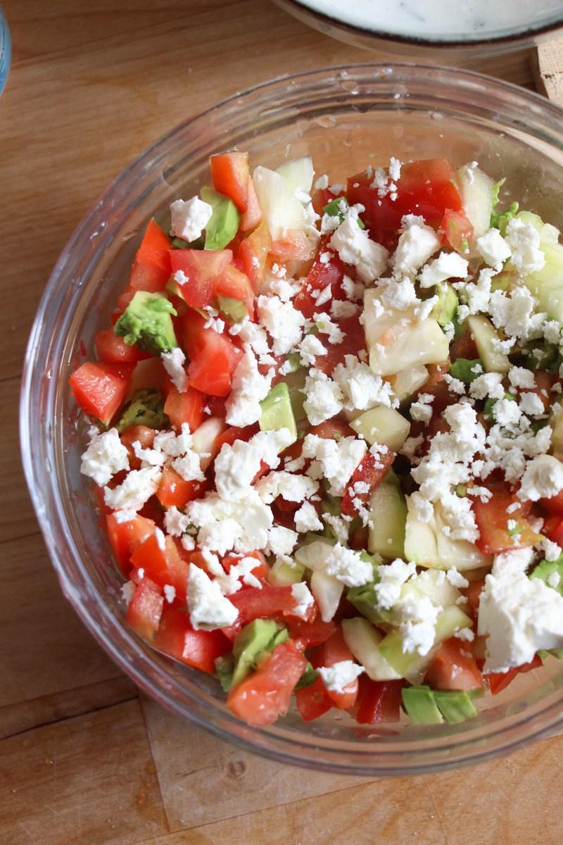 Ya estando aquí en España encontré la mezcla perfecta de sabores para acompañar el pescado sin opacar su frescura y sabor. Se trata de una ensalada fresca de pepino, tomate y queso feta, que bauticé como ensalada mediterránea. Y como toque final, esta preparación lleva una salsa de yogurt que le aporta suavidad y un toque ácido-agrio exquisito.