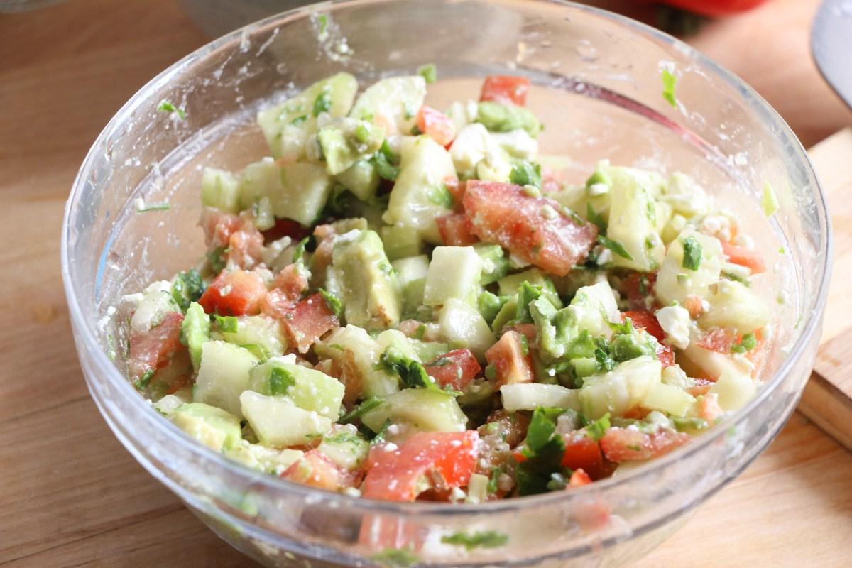 Mientras se cocina el pescado hacemos la ensalada mediterránea; cortar el tomate, el pepino y el aguacate en trocitos muy pequeños y agregar a un recipiente. Cortar finamente un puñado de cilantro o perejil y agregar a la mezcla. Finalmente añadir el queso feta desmenuzado y aliñar con 1 chorrito de aceite de oliva y sal. Mezclar bien todos los ingredientes.
