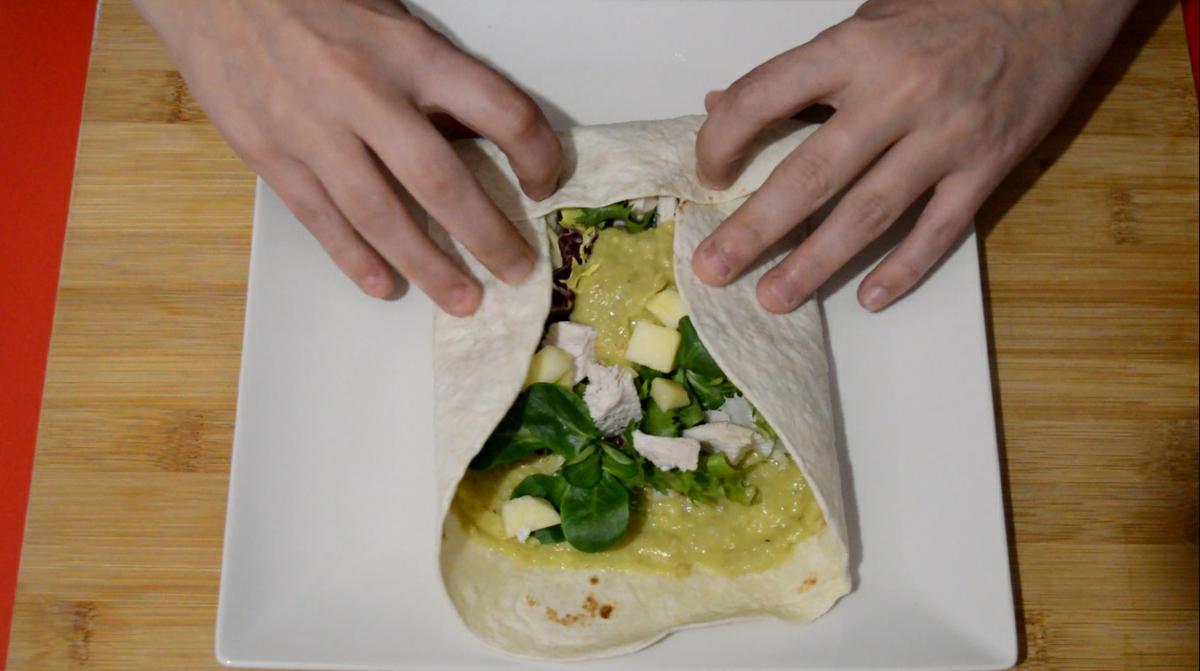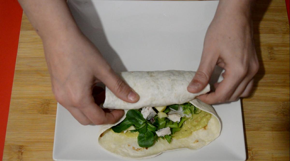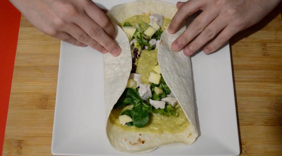 3. Cuando la pechuga ya esté fría, o templada si lo preferimos, será el momento de montar los wraps; para ello, colocamos las tortitas de trigo en un plato y metemos al microondas unos segundos. Sacamos y extendemos una base de guacamole, encima la mezcla de lechugas, unos dados de manzana y el pollo también a dados pequeños o tiras, como prefiramos. Enrollamos y servimos. Si queremos, podemos cortar por la mitad antes
