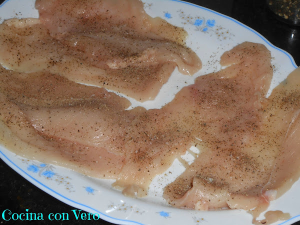 1/ Espolvoreamos por encima de los filetes de pechuga de pollo con la pimienta negra y la sal por ambos lados.