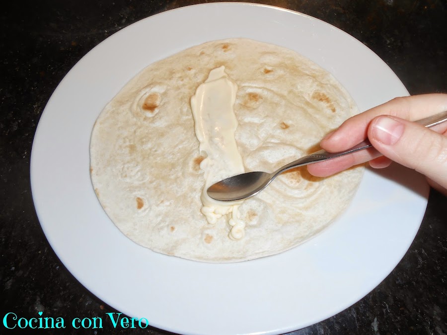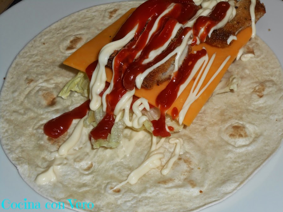 4/ Procedemos a montar los wraps, estendemos las tortitas de trigo sobre la mesa y estendemos un poco de mahonesa a lo largo del centro de la tortita con ayuda de una cuchara de postre, sobre ello distribuimos la lechuga, las rodajas de tomate, el queso, las tiras de pollo y lo salseamos por encima con mahonesa y ketchup al gusto.