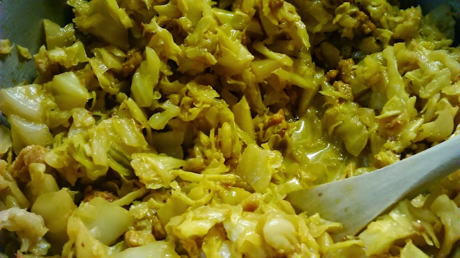 Picamos el repollo y lo rehogamos con un poco de aceite tapado a fuego lento 20 minutos. Destapamos y dejamos 10 minutos o hasta que quede sin líquido.