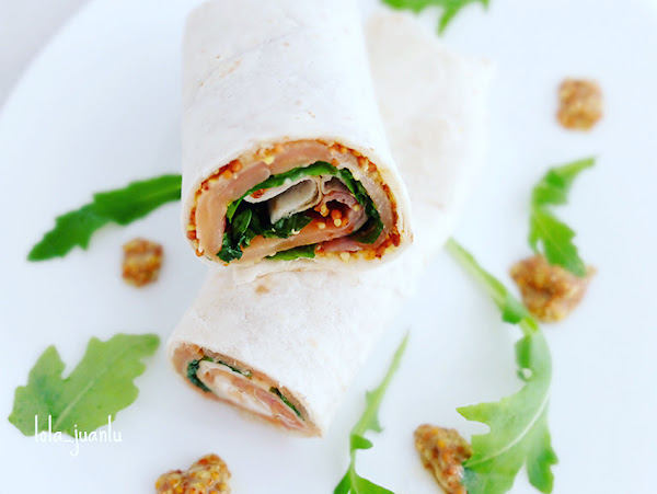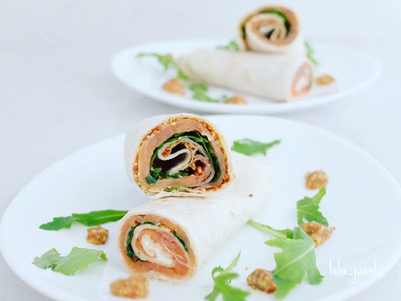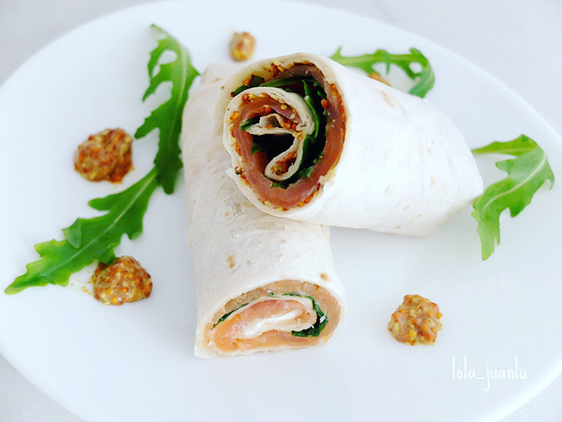 Cogemos la otra tortilla de trigo, colocamos la mostaza en el centro y la extendemos con ayuda de un cuchillo. Colocamos las lonchas de salmón sobre la capa de mostaza y sobre el salmón ponemos unas hojas de rúcula. Enrollamos la tortita de trigo y la cortamos por la mitad.