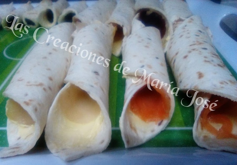 Se untan de mantequilla, se pone salmón ahumado o bacalao ahumado, se enrolla y listo.