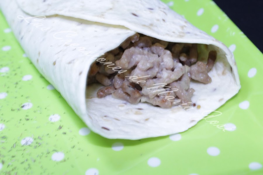 Hacemos la carne en una sartén con unas gotas de aceite de oliva, la pimienta, el ajo en polvo y la sal. Mientras hacemos la salsa de queso, metemos en el vaso de la Monsieur Cuisine todos los ingredientes de la salsa de queso, programamos 6 minutos velocidad 3 y 90º. Cuando este la salsa la echamos en la carne y lo mezclamos todo. Calentamos el wraps, en el microondas o en la sartén, echamos la carne con la salsa y enrollamos. Listo para comer.