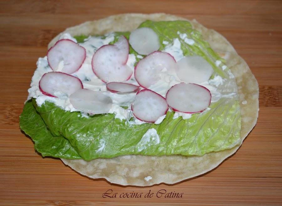 Extendemos las tortitas y repartimos sobre ellas las hojas de lechuga, el queso con las finas hierbas, el rábano,