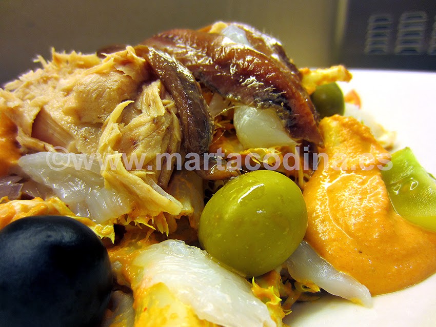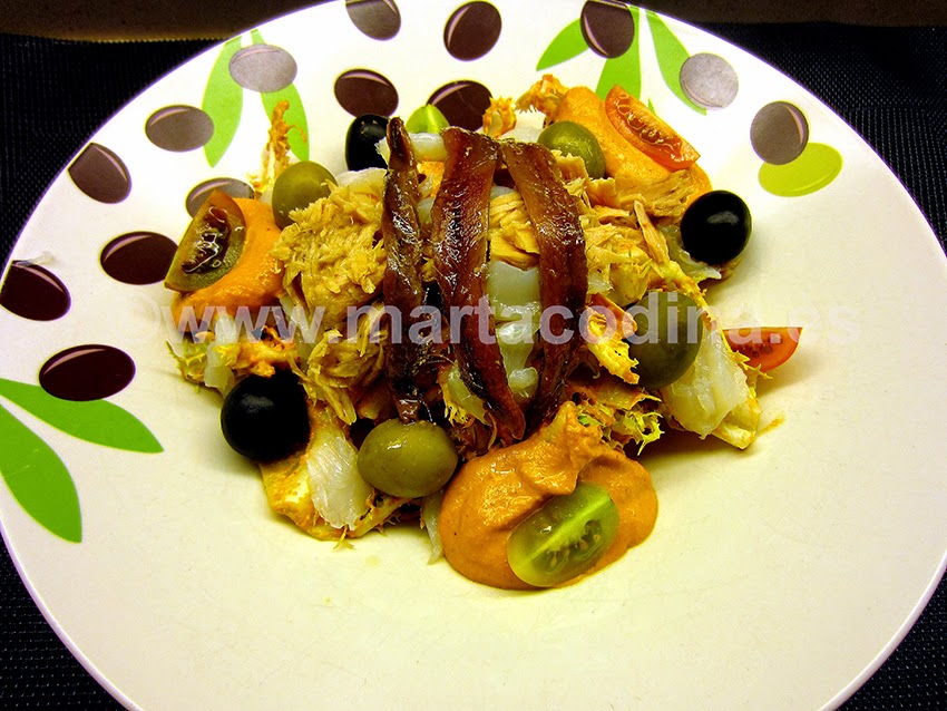 Disponer en un plato un poco de esta escarola (podéis ayudaros de un aro) y añadir el bacalao a tiras (se estira con las manos=esqueixar), el atún, las anchoas y las olivas. Regar con la salsa y adornar con unos tomates cherry.